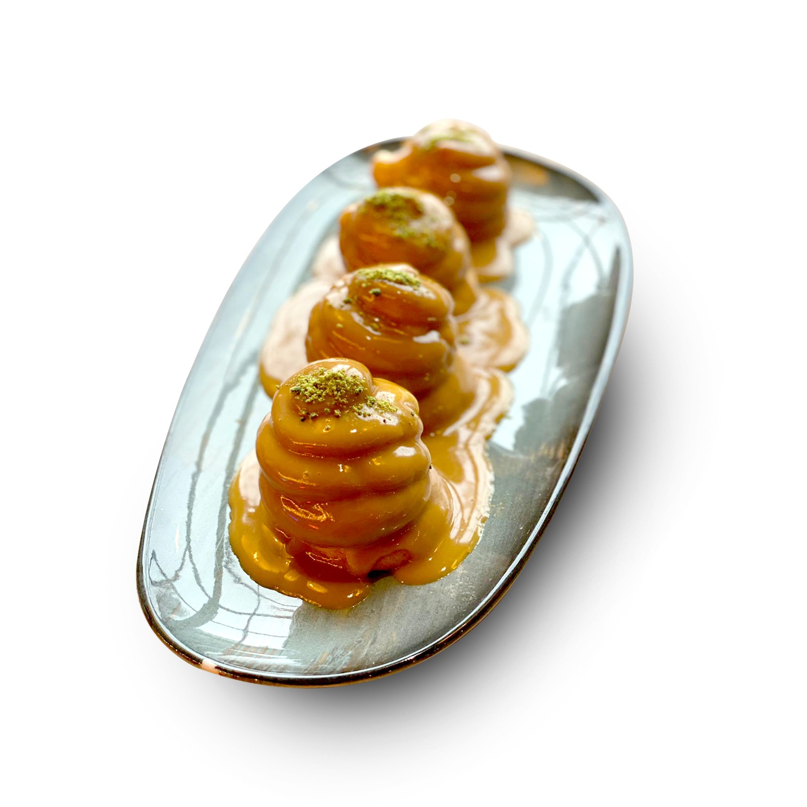 Pastacı kreması, Maraş Dondurmalı, Balkabağı sos ve Beyaz Çikolatalı Tahin sos, üzerinde Antep Fıstık Krokan ile.